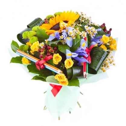 Букет с подсолнухом, кустовой розой, хризантемой, ирисами, гиперикумом и ромашкой с добавлением залени и декорированный карандашами