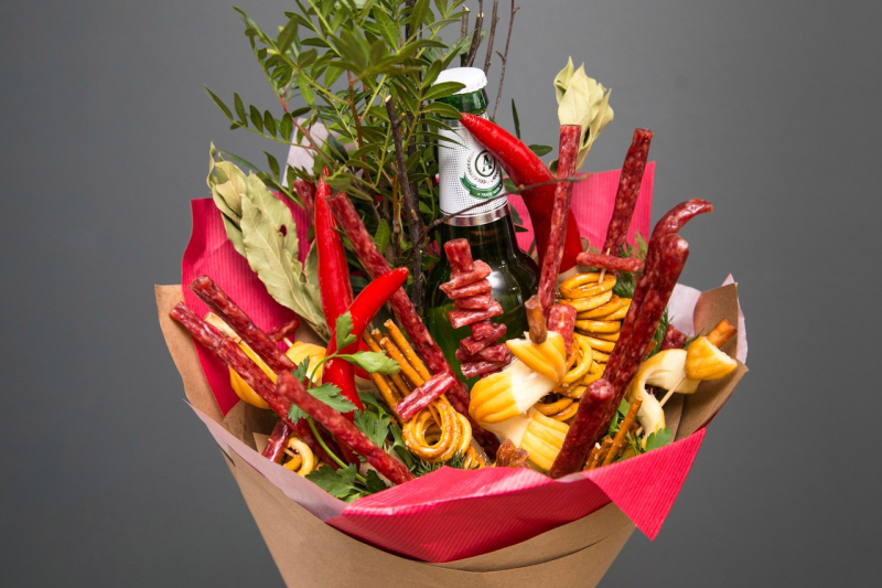 В качестве букета можно использовать не только цветочные композиции, но и комбинированные подарки. Например, можно сделать букет из бутылок пива или любимых напитков мужчины в единственном экземпляре или использовать цветы в сочетании с полезными мужскими подарками, такими как шоколад, зажигалки или наушники.