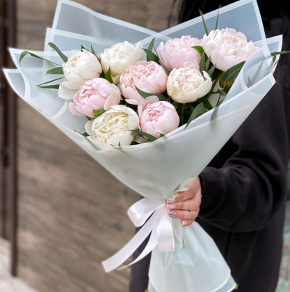 Букет из пионов в стильной упавковке с добавлением эвкалипта